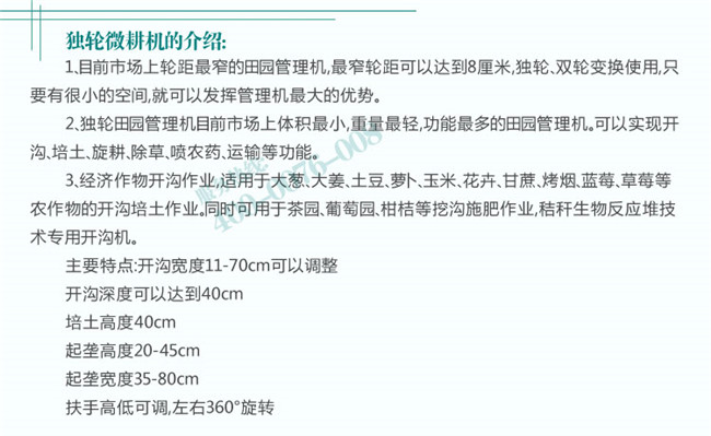 3、經(jīng)濟(jì)作物開溝作業(yè),適用于大蔥、大姜、土豆、蘿卜、玉米、花卉、甘蔗、烤煙、藍(lán)莓、草莓等農(nóng)作物的開溝培土作業(yè)。同時(shí)可用于茶園、葡萄園、柑桔等挖溝施肥作業(yè),秸稈生物反應(yīng)堆技術(shù)專用開溝機(jī)。