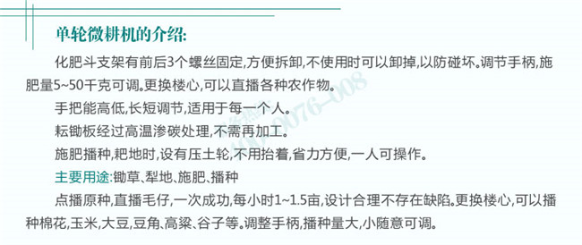 4.化肥斗支架有前后3個(gè)螺絲固定,方便拆卸,不使用時(shí)可以卸掉,以防碰壞。獨(dú)創(chuàng)的分離設(shè)計(jì),三角帶傳動(dòng),不存在頂鏈條的問題。播種施肥可雙行,單行,前后使用,耘地施肥可同時(shí)進(jìn)行。調(diào)節(jié)手柄,施肥量5~50千克可調(diào)。更換樓心,可以直播各種農(nóng)作物。
