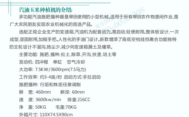 點播原種,直播毛仔,一次成功,每小時1~1.5畝,設(shè)計合理不存在缺陷。更換樓心,可以播種棉花,玉米,大豆,豆角、高粱、谷子等。調(diào)整手柄,播種量大,小隨意可調(diào)。